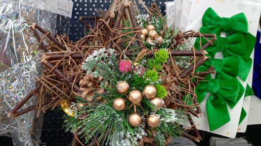 Всем привет! Как Ваше настроение? Осень в самом разгаре! Желтая листва радует глаз! А Фикс-прайс уже готовится к Новому году 2026🎄 это будет год лошади🐎 Пока новинок не особо много, но они уже начинают появляться! И так, поехали. Снежинка каркасная с мишурой. Симпатично будет смотреться на окне или на двери вместо венка. Все возможные бантики и бусы на елку. И вот такие!Зелёные как бы бархатные, очень приятные. Декоративные подвески. Вот интересно, кто этот ход придумал, делать из обычных палок и шишек композиции которые продают по 250р???? Свечки светодиодные...