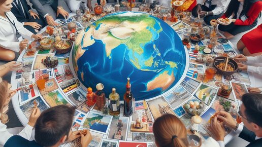 Эта концепция может быть адаптирована как для онлайна, так и для офлайн проектов на природе, на прогулочном теплоходе. Этот сценарий можно реализовать и просто на банкете в ресторане. Если у вас нет экранов, то добавляем шоу номера связанные со странами, которые можно подготовить силами сотрудников. По задумке сотрудники компании могут отправиться в те страны, где есть филиалы фирмы или части света, связанные с организацией деловым партнёрством. Также это могут быть страны выбранные путем общего голосования...