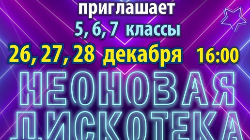 Встретим Новый 2026 год ярко ✨ Приглашаем учеников 5, 6 и 7 классов на неоновую вечеринку в Ейском дворце культуры с 26 по 28 декабря. ▫Вас ждёт: – эксклюзивная праздничная программа; – неоновые флэшмобы и зажигательные танцы; – весёлые конкурсы и активные игры...