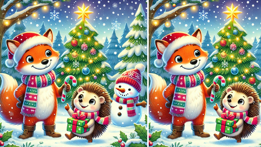 Погрузитесь в атмосферу праздника с этой яркой и доброй иллюстрацией! Лисёнок, ёжик с подарком и весёлый снеговик радуются волшебному зимнему вечеру у праздничной ёлки. Всё выглядит идеально, но здесь спрятались 11 отличий! Сможете найти их все? Ваше задание: Отправьте друзьям: Проверьте их наблюдательность и создайте вместе весёлое новогоднее настроение! Пусть все почувствуют дух праздника и азарта...