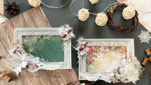 Добрый-добрый день! Сегодня я, Оксана Салова, хочу поделиться с вами праздничным вдохновением! Совсем скоро Новый Год, а там не за горами и Рождество!) А это значит, пришла пора доставать восхитительную коллекцию "Богемное Рождество" ! Я хочу представить вам две фоторамки, которые я декорировала с помощью материалов из этой коллекции. Какая же она нарядная, изысканная, праздничная! Сплошное вдохновение! Итак, я взяла две готовые фоторамки, подготовила основы: слегка ошкурила наждачной бумагой. Затем нанесла белый акриловый грунт...