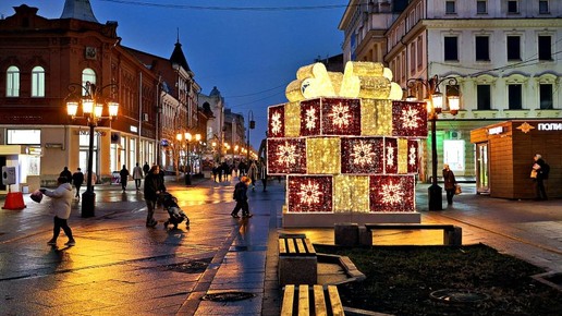 Главную пешеходную улицу традиционно украсили к Новому году. Можно сделать интересные снимки у светящегося большого подарка или под сияющими арками. В качестве локаций для фотосессии подойдут и входные группы кафе: ветви хвои у Vafel, столик среди елочек у Cin-cin, маленькая красная машина с гирляндой из флажков у «Приключений Шурика». А фасады старинных домов на заднем плане придадут снимку особый колорит. Главное место праздника традиционно радует обилием ярких локаций. Здесь и самая большая елка...
