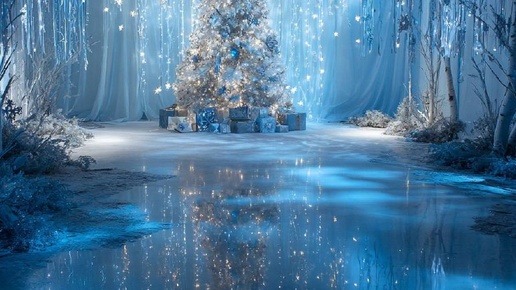 ". Центр — огромная зеркальная ёлка с ледяными украшениями и светящимися кристаллами. На полу искусственный иней и серебристый мох. Висят прозрачные нити со свисающими снежинками и каплями "льда". Мягкое голубое и белое сияние, как от северного сияния...