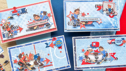 Добрый день, дорогие любители спорта! Сегодня на ледовой арене встречаются команды "Вымпел" и "Метеор". Такими словами спортивный комментатор скорее всего начал бы самый напряженный мультипликационный хоккейный матч, известный всем и мне, Елене Верес, по советскому мультику "Шайбу! Шайбу!". Моменты этого матча я отразила на открытках не совсем обычного формата, а удалось мне это благодаря классным вырезалкам из набора А5 "Шайбу! Шайбу!" (выпущенного по лицензии Союзмультфильма), и идеально подходящей к нему как по цветовому, так и по стилевому решению коллекции "Хоккей"...
