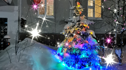 Ночь, снег, мороз, городок, ёлка, гирлянды - волшебно...