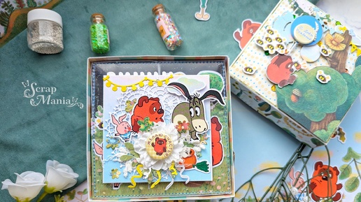 Всем привет! С вами Гредасова Катрин с работой из коллекции "Винни-Пух". Незабываемые с детства рисовки и персонажи сразу наполняют радостью, счастьем и воспоминанием из детства. Вспоминается голос Леонова и его милый-милый Винни-Пух. Моя подарочный набор состоит из коробки и открытки. Ее размер 13*13*8 см, снаружи оклеена бумагой "Винни-Пух. Лист 4" - я постаралась так подобрать принт на всех 4 стенках, чтобы можно было путешествовать от домика Винни-Пуха до домика Пятачка, а затем добраться до Совы и повстречать на своем пути Иа-Иа...