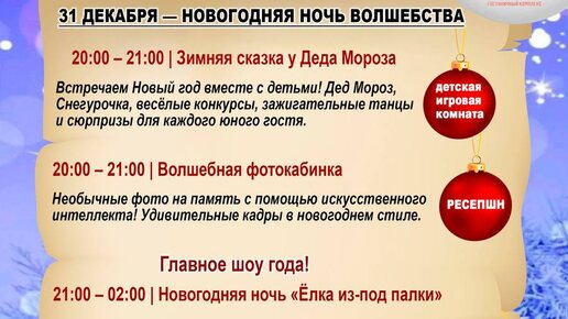 »! ❄️ Друзья, мы приготовили для вас настоящую сказку - грандиозную, добрую, душевную! Всё новогоднее волшебство с 31 декабря по 11 января собрали для вас в этой афише. Вас ждёт: 🎄 Уникальное шоу «Ёлка из-под палки» с салютом и исполняющим желания костром 🎤 Легендарная группа «Р72» и «Поющий барабанщик» ✨ Рождественские гуляния, народные забавы и мастер-классы 🧩 Увлекательные квизы, караоке и дискотеки на любой вкус 👨🍳 Атмосферные экскурсии,...
