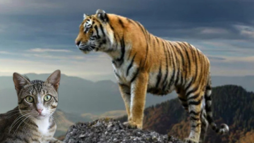 Кошка – это же самый настоящий хищник, например как грозный тигр, только что маленький. Действительно домашняя мурлыка хоть и небольшого размера, но повадки у нее как у самой настоящей полосатой хищницы. Такие же острые зубы и когти, такая же техника выслеживания и нападения на свою добычу. Интересно, а понимает ли сама кошка, что большой игр – это практически ее сородич? А сам тигр как относится к кошке? Примет ее за свою или же просто посчитает очередной добычей? И что бы произошло, если бы встретились огромный полосатый хищник и маленький домашний питомец...