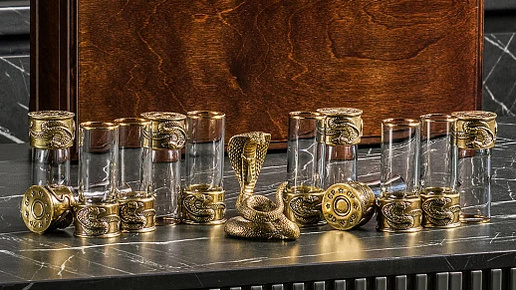 Что может быть лучше, чем встретить год Змеи с по-настоящему роскошным и запоминающимся подарком? Представляем вам идеальный вариант - подарочный набор, в который входят 12 уникальных стопок-патронов и статуэтка "Змея" в элегантной шкатулке.