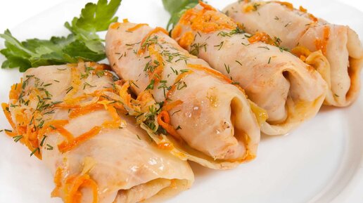 Голубцы. Капуста белокочанная 1 шт., рис 1 стакан, фарш мясной 0,5 кг, морковь 1 шт., лук репчатый 4-5 шт., томатный соус 3 столовые ложки, масло растительное для жарки, перец молотый, сахар, соль. Сначала подготовим капустные листья для голубцов. Для этого снимаем верхние грязные и повреждённые листья. Далее вырезаем середину и кладём капусту кочаном вниз в подсоленную воду. Доводим до кипения и кипятим 10-15 минут, затем переворачиваем капусту. Листья легко отделяются с помощью щипцов. Листья капусты, которые ещё не проварились, оставляем вариться ещё 10-15 минут...