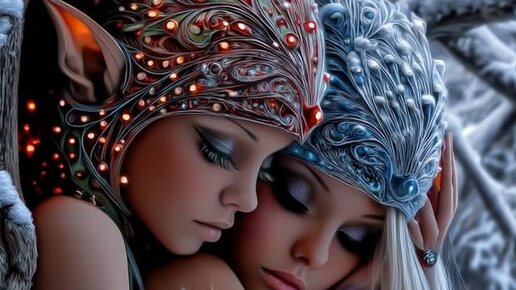 knitted outfits (green/red wool coats, striped tights, felt boots, tiny bells), rosy cheeks and warm smiles, standing on a snowy path in a quiet winter forest. Tall pine and fir trees covered in heavy snow, frosted branches, sparkling ice crystals, soft falling snowflakes, warm lantern glow hanging from branches, cozy golden light contrasting with cool blue twilight shadows. In the background: a small wooden cabin with warm window light, subtle smoke from chimney, distant silhouettes of deer. Foreground:...