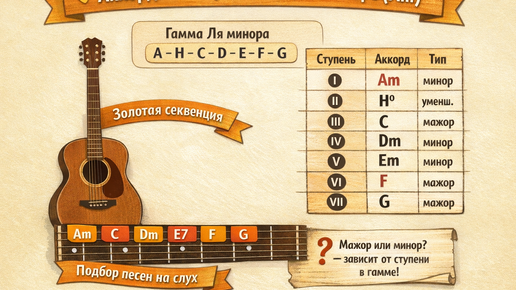 Если вы играете песни на гитаре и подбираете аккорды по слуху, то рано или поздно сталкиваетесь с вопросом: 👉 Почему одни аккорды мажорные, а другие минорные — и как это понять быстро? Особенно часто путаница появляется в “золотой секвенции” — любимой последовательности гитаристов, которая встречается в огромном количестве песен. То есть в таких типичных ходах, где аккорды красиво “перетекают” один в другой и звучат очень по-песенному. И хорошая новость в том, что это не угадывание, а вполне понятное правило...