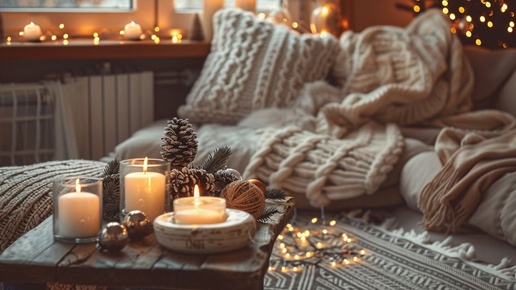 candles in glass holders on a wooden coffee table, soft knitted throw blanket, textured linen pillows, faux fur rug, pine branches and subtle Christmas ornaments, warm ambient lighting, hygge atmosphere,...