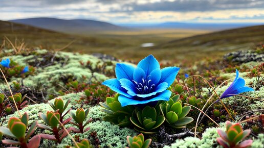 Северная природа, кажется, создана из контрастов: бескрайние снежные равнины соседствуют с коротким, но насыщенным цветением. Среди самых примечательных цветов тундры — полярный мак и горечавка. Эти растения удивляют не только своей выносливостью, но и яркими оттенками, которые украшают монохромный северный пейзаж. Горечавка — настоящий символ северного лета. Её глубокий синий цвет выглядит так, будто небо решило упасть на землю...