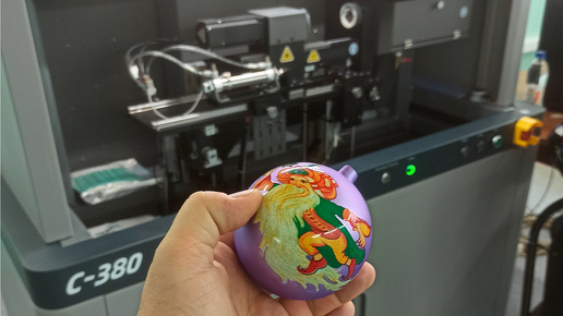 Новый год совсем на носу и эта инсталляция как нельзя кстати. Есть первый в России запуск новейшего УФ-принтера для печати на сферических и цилиндрических предметах Sprinter C‑380! Он состоялся на прославленной фабрике елочных игрушек "Елочка" из подмосковного Клина, который по праву именуется родиной отечественного стеклодувного промысла.