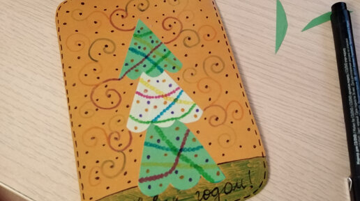 Продолжаем подготовку к самому главному празднику в году - к Новому Году. Мы уже нарядили елку. А как насчет наряжения елки на открытке? Для начала вырежем три яруса елочки - верх треугольничком, а низ - фигурным. Склеим их и украсим открытку стежками по периметру...