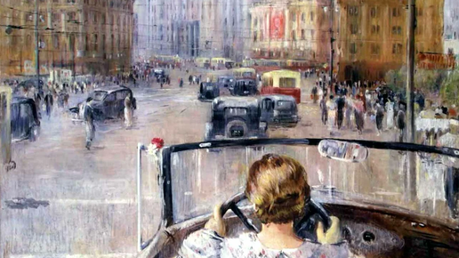 Хорошая картина. Утро, только что прошел дождь. Москва 1930-х годов: улица Охотный ряд и Театральная площадь (тогда она называлась Площадь Свердлова). Здание бывшей гостиницы "Континенталь", которое мы больше никогда не увидим, т.к. в начале 1970-х гг. его снесли. В Москве уже построено метро: буква М на здании станции "Охотный Ряд". За зданием метро - Дом Союзов, где проходили съезды Советов, детские новогодние елки, но также и судебные процессы. К слову, в 1937 году завершился процесс по "делу Тухачевского"...