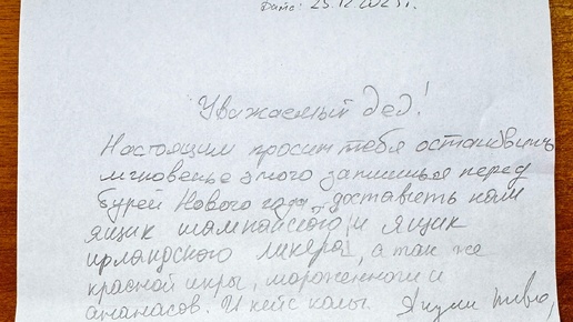 Дорогой дедушка де! Официально, торжественно и с блёстками на душе просим: поставь на паузу этот предновогодний хаос, пока куранты не начали нервно кашлять, и подкинь нам по списку: — ирландского ликёра (чтоб душа пела с акцентом), — красной икры (чтоб жизнь была намазана щедро), — мороженого (для внутреннего ребёнка), — ананасов (потому что мы можем), — и целый кейс колы, аминь газированной. Далее по духовной части: пошли нам всего хорошего — много, с горкой...