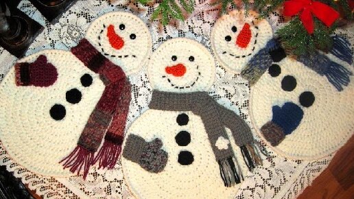 Вязаные крючком снеговики — прихватки, салфетки, аппликация