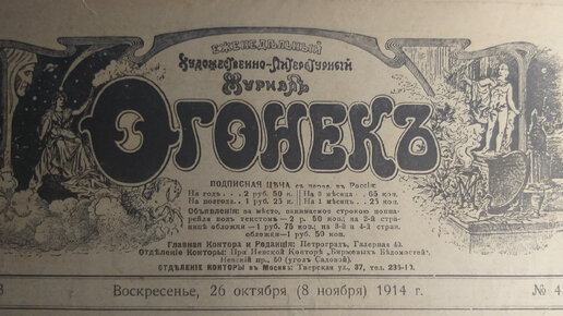 В тетушкином сундучке, среди множества открыток, сохранились также несколько газет и журналов. С одним из этих экземпляров я и хочу вас познакомить. Это еженедельный художественно-литературный журнал «Огонек» за 26 октября *(8 ноября) 1914 года. Внешне этот журнал походил больше на газету, да и начал он выходить в свет 9 декабря (21 декабря по новому стилю) 1899 года, как еженедельное иллюстрированное литературно‑художественное приложение к газете «Биржевые ведомости», издателя Станислава Максимилиановича Проппера...