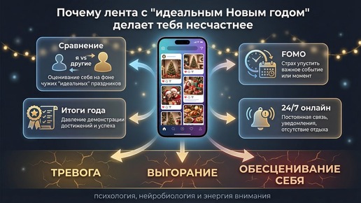 Немного психологии, нейробиологии и практик, чтобы пережить декабрь в соцсетях без выгорания Каждый декабрь лента превращается в парад «идеальных жизней»: чужие ёлки, отпуска, тела «до/после», бизнес‑итоги, счастливые семьи. Снаружи это выглядит как вдохновение. Но мозг часто реагирует иначе: усиливается тревога, чувство несостоятельности и выгорание. Почему так происходит — если по полочкам? 1. Мозг работает по принципу сравнения, а не справедливости Для психики любой поток картинок — это не просто красивые фото, а материал для сравнения “я vs другие”...