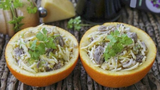 Эффектный салат в апельсине с мясом, сыром и яблоком. Идеален для праздничного стола!