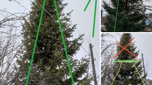 На днях пришёл вопрос про ёлку возле проводов, можно ли её досмерти не пилить :) Конечно, в таком случае может быть несколько вариантов сохранности ёлки. Ниже расскажу о каждом способе. 1.Первый, самый красивый и эстетичный это обрезать её конусом по всему периметру. Но для начала оценить свои возможности: хватит ли сил ежегодно её формировать. Для этого нужно приобрести высоторез (например Fiskars up84), найти длинные палки, которые достают до верхушки. Установить их (примерно как указано зелёным цветом)...