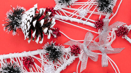 Показываю что получится если мишуру пустить на помпоны, веточки склеить, а шишки покрасить