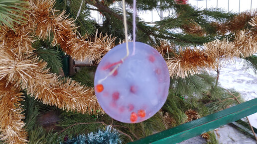 Хит этого сезона - ёлочные игрушки изо льда. Давно хотела что-нибудь сделать изо льда. Например, в прошлом году воспитательница в детском садике сказала принести разрезанные коробки от молока. Они наливали туда воду, оставляли на улице, и у них получилось много ледяных кирпичей для крепости. В этом году во дворе поставили ёлку большую и красивую, но без игрушек. Ладно хоть гирлянды и мишуру повесили. И решили мы сделать дома в морозилке ледяные игрушки из природных материалов, чтобы даже если они растают, мы несильно намусорили...