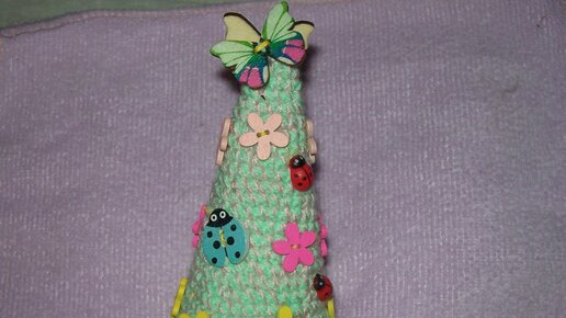 Для изготовления этой поделки потребуется немногое. Нужно взять белый картон, клей, крючок, пряжу, декоративные пуговички. Для начала сделаем из картона, заранее приготовленного нами, конус...