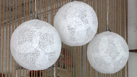 Как сделать нежную, кружевную люстру из обычного материала? Такая люстра обновит и подарит очарование и романтику в любой интерьер. Для начала нужно вырезать примерно одинаковые круги из тюля или другой кружевной ткани. Надуйте большой плотный воздушный шарик. На шарик нужно наклеить кружочки тюля с помощью ПВА или обойного клея. Дать высохнуть материалу примерно 2 – 4 дня. После этого лопнуть шарик. Останется одна ткань в виде шара. Теперь стоит вырезать отверстие под плафон нашей необычной люстры...