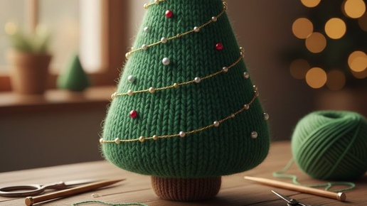 Эта ёлка вяжется как простой конус, а затем набивается наполнителем. 📌 Вводные данные и материалы ВАМ ПОТРЕБУЕТСЯ: Пряжа: Толстая или средняя (полушерсть, акрил, или "травка" для пушистого эффекта) зеленого цвета. Спицы: Чулочные (набор 5 шт.) или круговые для Magic Loop. Выбирайте на 1–2 размера меньше, чем рекомендовано для пряжи (например, если пряжа для № 4, возьмите № 3 или № 3,5). Дополнительно: Наполнитель (синтепон, холлофайбер), игла с широким ушком, ножницы, маркер начала ряда. Украшения: Мелкие бусины, бисер, пайетки, контрастная нить для "гирлянды"...