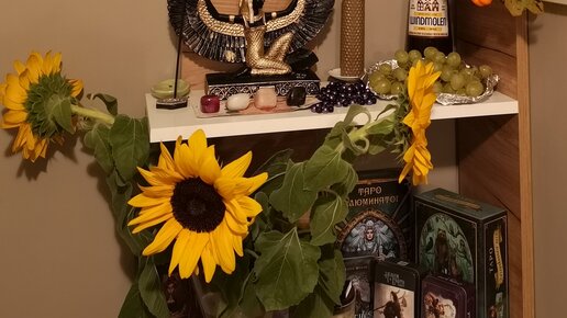 Добрый день, мои эзотеричные 🖤 Друзья, делюсь с вами вариантом украшения Алтаря на Ламмас. Итак, мой алтарь выглядит вот таким вот образом, но не уверена, что это окончательный вариант, ведь время до Ламмаса ещё есть! Самый главный герой на этом алтаре - это бог Дионис. На первый взгляд, вы можете даже и не понять, где он, а он представлен бутылкой пива! Не скупитесь на фантазию и если у вас нет статуэтки какого-то бога, то вы можете придумать свою ассоциацию и бог будет доволен вдвойне! Сезонных богов я меняю, а вот Изида стоит на алтаре всегда...