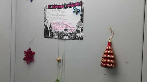 Дня три-четыре назад, возвращаясь с дочкой с прогулки и зайдя в лифт, я с удивлением обнаружила, что кто-то его украсил к Новому году. Мы живем в этом доме почти 4 года, и это впервые, когда лифт украсили. Кто именно это сделал не знаю, человек, подаривший всему дому новогоднее настроение, решил остаться инкогнито. Повесили елочные игрушки, снежинки, а также мишуру, уложенную в форме елочки. Также приклеено стихотворение-пожелание с Новым годом. Хоть оно и написано с ошибками, но настроение поднимает...