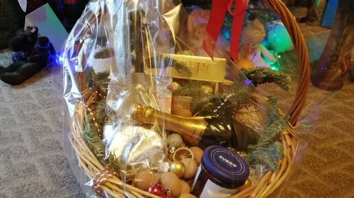 Сын привез на Новый год подарочную корзину: шампанское, чай, конфеты и печеньки в красивом мешочке