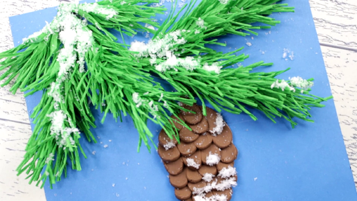 Создаем заснеженную еловую веточку с шишкой, с помощью гофрированной бумаги и пластилина.
