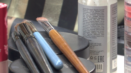 Я беру черные тени, очень маленькую кисточку, чтобы можно было сделать изящный штрих во внутреннем уголке глаза. И вытягиваем уголочек немножко к переносице. Спокойная тень в натуральной гамме, коричнево-розовой, которая уместна на все случаи жизни...