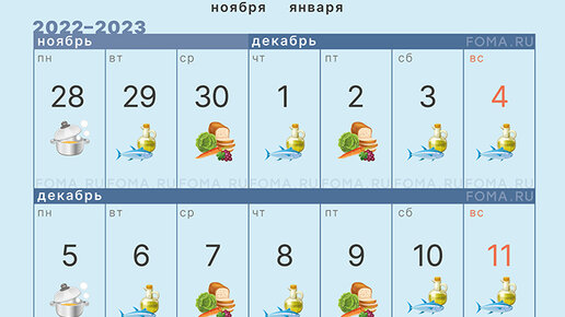 Календарь питания Рождественского поста Рождественский пост в 2022 году начинается за 40 дней до Рождества — 28 ноября. Его также еще называют Филиппов пост, так как он начинается сразу после дня памяти апостола Филиппа. Во время Рождественского поста по церковному монастырскому уставу (типикону) следует воздерживаться от продуктов животного происхождения (мясо, яйца, молоко). До дня памяти святителя Николая (19 декабря) в понедельник можно есть горячую пищу без масла, в среду и пятницу — строгий пост (сухоядение — овощи, фрукты, хлеб)...