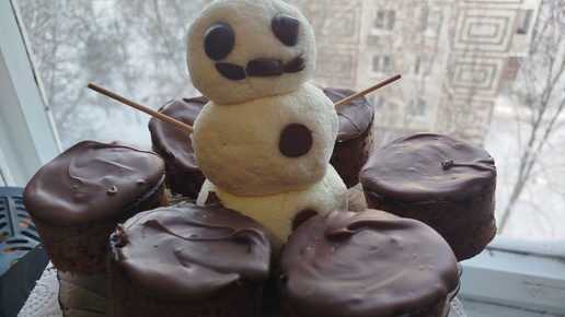 Сам снеговик сделан из кокосовой стружки и сгущённого молока. Пеньки - шоколадный бисквит. Внутри арахис с соленой карамелью, сверху покрыты молочным шоколадом.