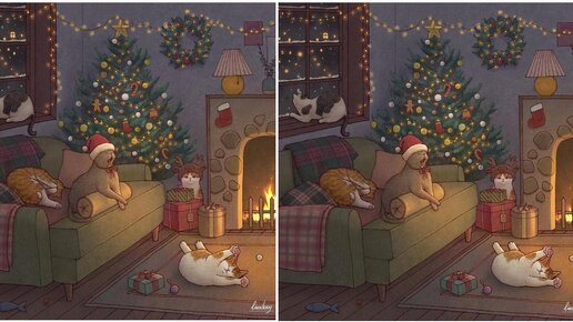 Найди отличия на новогодних картинках с озорными котятами