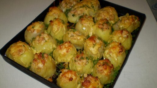 От этой картошечки все с ума сходят! Вкусная, аппетитная - ну как тут устоять? Эту картошечку я буду готовить на новогодний стол, и вам советую - рецепт проще простого, ингредиенты все доступные и простые. Приготовление: Картофель выбираем примерно одинаковый по размеру, не крупный, очищаем от кожуры. Ингредиенты я указываю на 18-20 картофелин среднего размера. В картофеле ножом делаем небольшое углубление (как бы вырезаем немного, чтобы получилась ямка). Углубление делаем небольшое, это не фаршированный картофель...