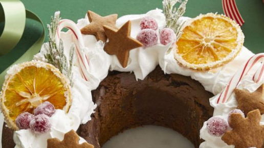 Для кексика: Продукты: Для декорирования – один апельсин; 200 граммов сахарного песка; 3 ветки розмарина; немного клюквы либо вишни (мороженной либо свежей); небольшое количество печенья; 3 сахарные тросточки. Для покрытия – 3 больших яйца; 150 граммов сахарного песка; горсточка соли; ванилиновую пряность – на острие ножа. Заготовка: Помажьте формочку для выпечки растительным маслом и чуть-чуть рассыпьте мукой, смахивая избытки. В чашку положить 360 граммов муки, какао, загустителя, соли и соды...