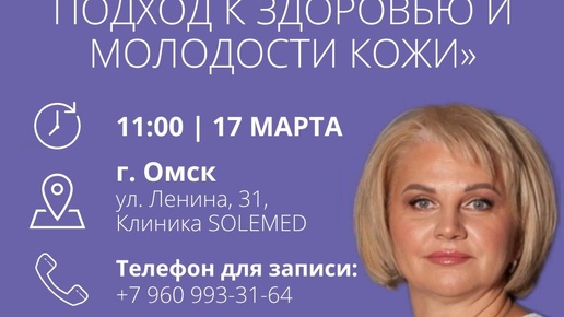 💛 Тема💟: «REVI — молекулярный подход к здоровью и молодости кожи» 📅 Дата: 17 марта 🕙 Время: 11:00 📍Место: г. Омск, ул. Ленина, 31, Клиника SOLEMED 👩‍⚕️ Спикер: Воронцова Елена Ивановна — врач-дерматовенеролог, косметолог, член национального альянса косметологов и дерматологов, медицинский советник REVI. ✍ Программа: 11.00–13.00 Теоретическая часть: - Механизмы старения кожи: от клеточного уровня к внешним...