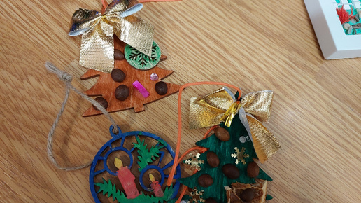 А ещё у нас были вот такие игрушки, тоже сделанные своими руками. Конечно нужны заготовки из дерева, декор и зерна кофе! Крепится все на обычный клей пва. Кстати, деревянные игрушки можно просто раскрасить или украсить пластилином...