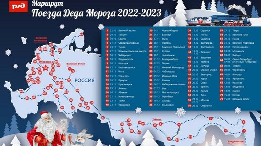 Российские железные дороги опубликовали маршрут, по которому в этом году проедет поезд Деда Мороза. В УрФО поезд прибудет в конце ноября. 28 ноября Дед Мороз будет в Тюмени, 29 – в Каменске-Уральском и Кургане, 30 – в Челябинске, 1 декабря – в Екатеринбурге. Как сообщает пресс-служба РЖД, в составе поезда в этом году будет 19 вагонов, в том числе салон-приемная, вагон-сцена, вагон «Сказочная деревня» для игр и квестов, вагоны-рестораны, вагон-лавка и т. д. Во главе поезда – паровоз, украшенный гирляндами из сотен фонариков...