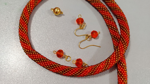 Вообще-то, эта штука планировалась, как лариат с кленовыми листиками. Я даже схему плетения такого листика нашла... однако, осень была безбожно потрачена на разного рода форс-мажоры. Поэтому возникла идея трансформировать изделие в новогоднее. Давно заметила у себя гиперфиксацию на цветах. Если мне внезапно "западает в душу" определенный цвет, то я начинаю его "вырабатывать", пока не надоест. Тут, вот, мы имеем дело с оттенками оранжевого. К сожалению, та пластика, которая у меня есть, имеет немного более желтый оттенок, чем бисер, из которого вязался жгут...