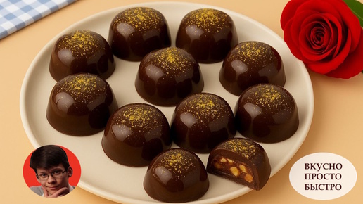 Приветствую вас на канале Вкусно Просто Быстро! Эти конфеты – вершина кондитерского искусства: идеально глянцевые, с хрустящим карамельным сюрпризом внутри и благородным золотым блеском. Это проще, чем кажется! Готовьтесь творить шедевры и покорять своих гостей! Подготовка: 400-500 г темного шоколада (какао не менее 55%) порубите мелко ножом. Расплавление: 2/3 шоколада растопите на водяной бане или в микроволновке короткими импульсами, помешивая, до температуры 45-50°C. Охлаждение: Снимите с огня, добавьте оставшийся 1/3 рубленого шоколада...
