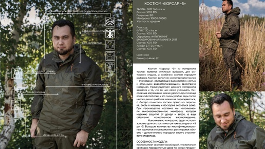"Корсар -5" выполнен из материала таслан — это гладкий, немного шуршащий материал, обладающий высокой прочностью и отличными водоотталкивающими свойствами. Преимуществом данного материала является и то, что за ним легко ухаживать. Несложные загрязнения можно удалить при помощи влажной салфетки, и это очень удобно, ведь после целого дня на рыбалке можно не переодеваться, а быстро почистить костюм прямо на парковке, сесть в машину и поскорее оказаться дома. При производстве костюма мы использовали...