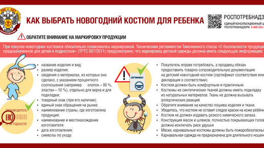 Впереди детские новогодние ёлки, где многие мальчики и девочки превратятся в героев любимых сказок. ФБУЗ "Центр гигиены и эпидемиологии в Республике Бурятия" напоминает о следующих рекомендациях при выборе новогоднего костюма для ребёнка: При покупке новогодних костюмов обязательно ознакомьтесь маркировкой. Техническим регламентом Таможенного союза «О безопасности продукции, предназначенной для детей и подростков» (ТРТС 007/2011) предусмотрено, что маркировка детской одежды должна иметь следующую...