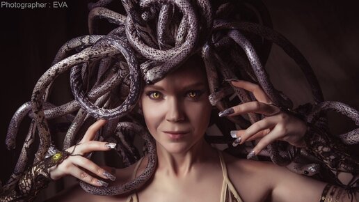 Пришло время рассказать, как появился этот восхитительный образ Медузы Горгоны. Фотографии с фотосессии и цены в конце статьи. Расскажу подробнее как я сделала "шапку Горгоны" своими руками и как осталась довольна результатом. Я Очень долго думала как крепить все это к голове, к то время, я уже определилась с образом, с тем из чего будут состоять змеи, какое платье, аксесуары и т.д. Уже даже ткань для змей купила! Вопрос был именно в том как это все закрепить на голову, чтоб не смотрелось ужасно и чтоб было удобно...